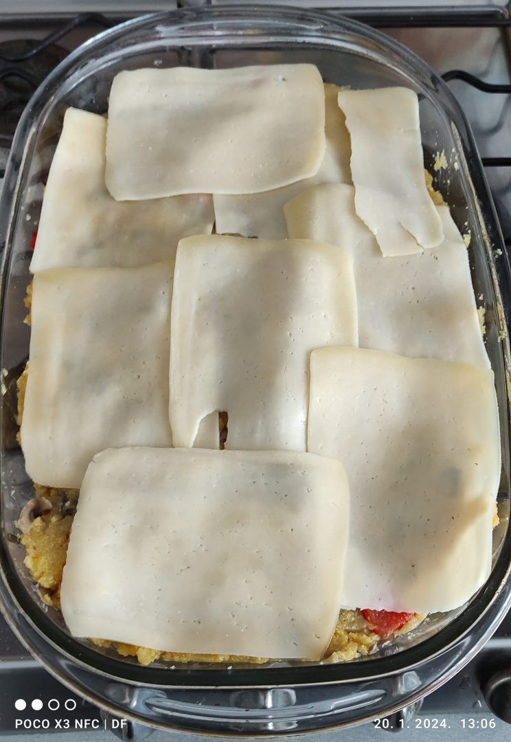 “Dinstati” najmanje 300 g jestivih neotrovnih gljiva na luku. Kasnije dodati papriku. Zaliti sa dosta vode. Kada zakipi umiješati kukuruznu krupicu. Sve staviti u posudu za pečenje, prekriti sirom, parmezanom, po želji vrhnjem. Ne kažem da tu ne bi dobro došla slanina. Od začina uglavnom sol i papar. Dopušteno je mijenjati recept. Ako vam ne će biti fino, ne krivite mene. Znači da vam nije uspjelo.