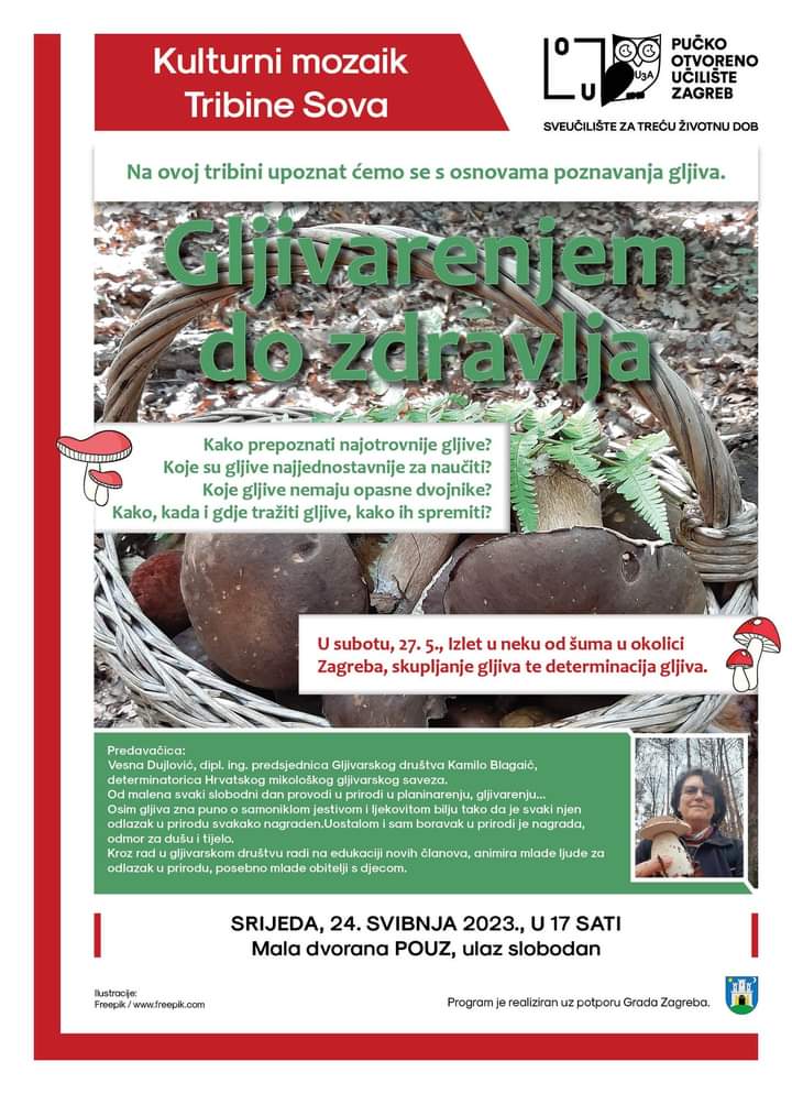 Srijeda, 24. 5. 2023. u 17 sati Predavanje: Vesna Dujlović “Gljivarenjem do zdravlja”