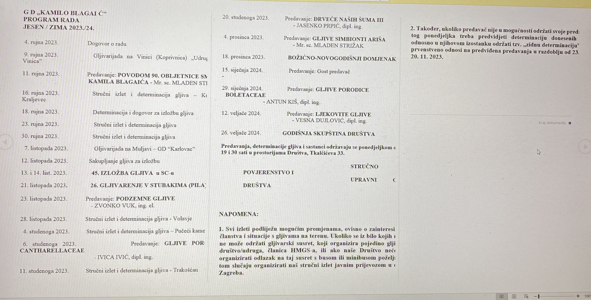 Prvo uvodno predavanje, općenito o Društvu i gljivarenju, održat će naša determinatorica Vesna Dujlović, a dalje nastavljamo s predavanjima po predviđenim temama. Proći ćemo sve gljive koje se mogu naći na Gljivarskom ispitu.